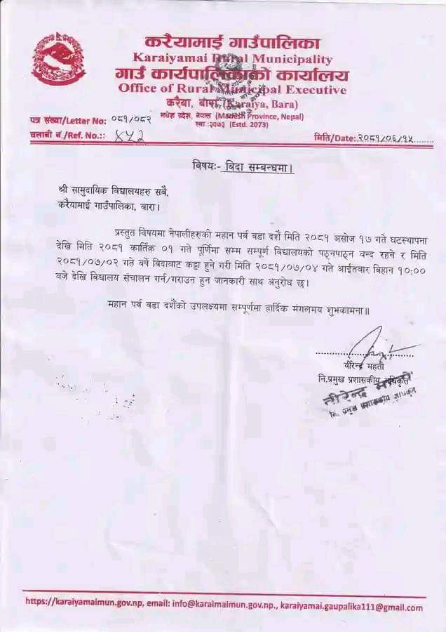 बारा करैयामाई गाउँपालिकाको सुचना Tags: Post navigation Previous Previous post: पर्साको बहुदरमाई नगरपालिकाका मेयर सिंघासन साह तेली कमाउ धन्दामा मात्रैNext Next post: जितपुरसिमरा उपमहानगरपालिकाको सुचना suraj Bikram Related Posts बाराको गतिविधि को अभियान पिउस तामाङ लाई दिउ नयाँ जीवन दान चाड बाडको मौका छोपी कोल्हवी बजारमा अखाद्य बस्तु विक्रि वितरण शिक्षा ऐन विपरीत शुल्क उठाउदै बारा उमजनका जनता मावि Leave a Reply Cancel replyYour email address will not be published. Required fields are marked *Comment * Name * Email * Website Save my name, email, and website in this browser for the next time I comment.