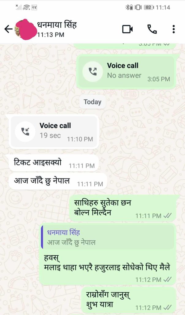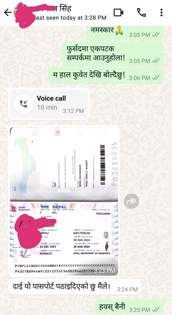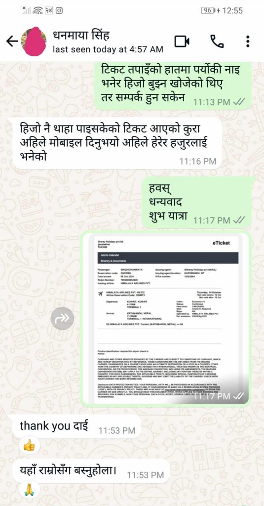 नेपाल घर जाजरकोटकि धनमाया सिंह वैदेशिक रोजगारीको सिलसिलामा एकमहिना अगाडि कुवेत आएकी थिइन् उनिलाइ दलालीले दुबईको भिजिट भिसामा ल्याइ कुवेतमा घरायसी कामकोलागी बेचेको त्यो कुरो उनिले पत्तै पाइनन तर केही समय पछि उहाँ बेचिएको थाहा भएपछी उहाँको मानसिक सन्तुलन राम्रो हुन छाडिसकेको थियो त्यसैमा काम गर्दै जादा नेपालमा उहाँको बुवापनि बित्नु भए छ ।यसले झन उहाँमा अर्को बज्रपात थुपार्यो र मानसिक पिडाले गर्दा उहाँपनि ठुलै बिमारी पर्नु भयो घरमा साहु साहुनी पनि नराम्रा परेछन उहाँको उपचारमा खासै चासो दिएनन् त्यसपछी उहाँले नेपाल फर्कन पाम भनी एजेन्ट र विभिन्न संघ सस्थालाइ गुहार्न थालीन तर कुवेतको हकमा नेपाल सरकारले बन्देज गराएको घरायसी कामदारको हकमा दूतावासले त राम्रो पहल गर्न सक्दैन हामिले कसरी गर्न सक्छौ र भन्ने खालको जवाफहरु मात्रै पाइन्