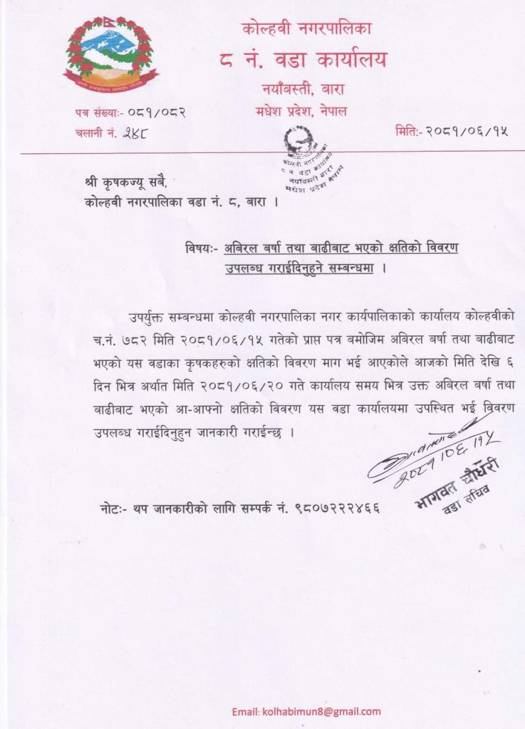 कोल्हवी नगरपालिका कोल्हवी वडा नं ८ को सुचना Tags: Post navigation Previous Previous post: कृषि ज्ञान केन्द्र बाराको सुचनाNext Next post: महागढिमाई नगरपालिकाको सुचना suraj Bikram Related Posts ज्यानको जोखिम मोलेर कोल्हवी नगर प्रमुखले हात्ती धपाए अन्तिम परिक्षाको मुखमा कोल्हवीका शिक्षक हरु पढाउन छोडेर संगठन बनाउदै। फेरी आयो तिनवटा जंगली हात्ती: Leave a Reply Cancel replyYour email address will not be published. Required fields are marked *Comment * Name * Email * Website Save my name, email, and website in this browser for the next time I comment.