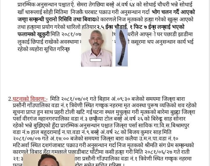 बारामा धारिलो हतियार प्रयोग गरि हत्या गर्ने जिल्ला बारा महागढीमाई नगरपालिका वडा नं.- १ सेमरा तेगछिया नयका टोल बस्ने अन्दाजी बर्ष ५५ को भुमि सुधार भन्ने श्री नारायण प्रसाद यादवलाई सेमरा तेगछिया सडक खण्डमा मिति २०८१/०७/१० गते साँझ अन्दाजी ७:३० बजेको समयमा पसलबाट घर जाने क्रममा धारिलो हतियारले टाउको पछाडि गर्दनमा प्रहार गरी हत्या गरेको […]
