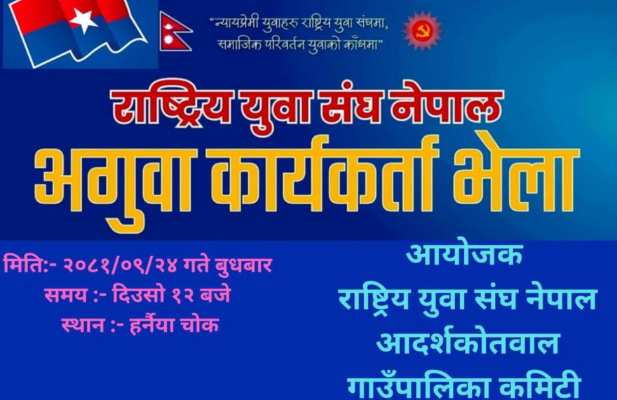 राष्ट्रिय युवा संघ नेपाल जिल्ला कमिटी बारा ले संगठन का गतिविधि , युवा भेला तथा छलफल कार्यक्रम लाई तिब्रता दिएको छ ।यहीँ पौष १९ गते राष्ट्रिय युवा संघ कोल्हबी नगर कमिटी युवा भेला सम्पन्न गरेको संगठन ले , बारा जिल्ला कमिटी लाई ब्यस्त राख्दै लगातार का आफ्ना कार्यक्रम को तालिका संगठन जिल्ला सचीव दिपेन्द्र सुवेदी […]