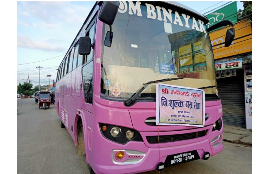 बाराको गढीमाई मन्दिरको दर्शन गर्न चाहनेहरुका लागि कलैयाबाट निःशुल्क बस सेवा सुरु गरिएको छ । गढीमाई मन्दिर लाग्ने पञ्चवर्षिय मेला महिना सुरु भएसंगै दर्शनार्थीहरुको सहजताका लागि निःशुल्क बस सेवा सुरु गरिएको हो । ओम विनायक बसले कलैयाचोकबाट गढीमाइको दर्शन गर्न चाहने भक्तजनहरुको लागि निःशुल्क बस सेवा उपलब्ध गराउने भएको छ । कलैयाको भरतचोकबाट गढीमाइ मन्दिरसम्म […]